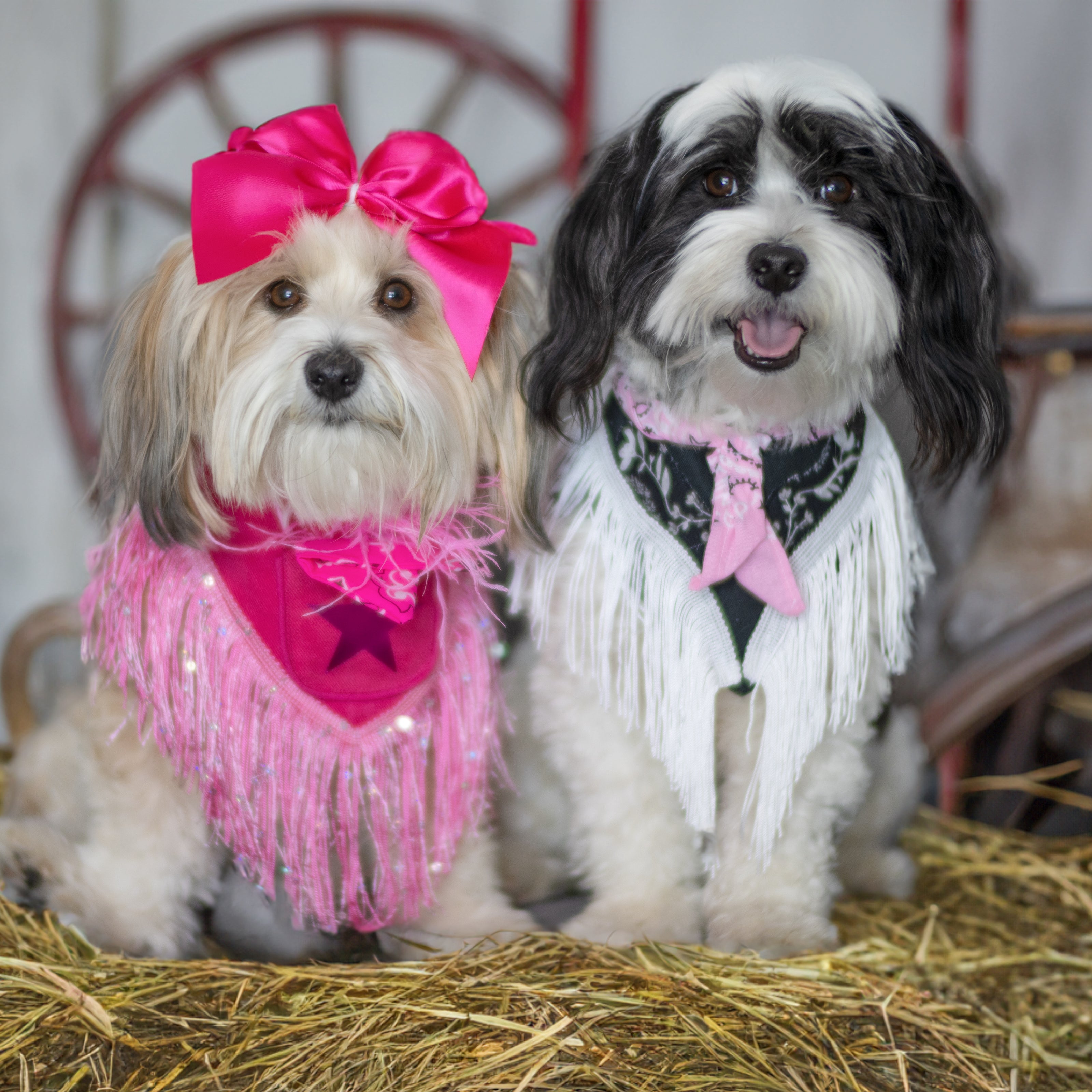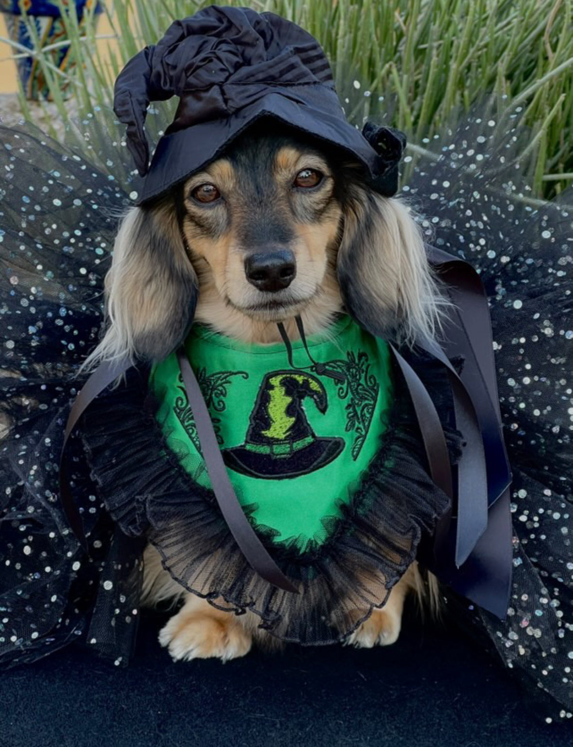A special custom order for Charlotte’s birthday — a three-piece couture set of skirt, bow, and bandanna — with Snickers in his coordinating couture bandanna.