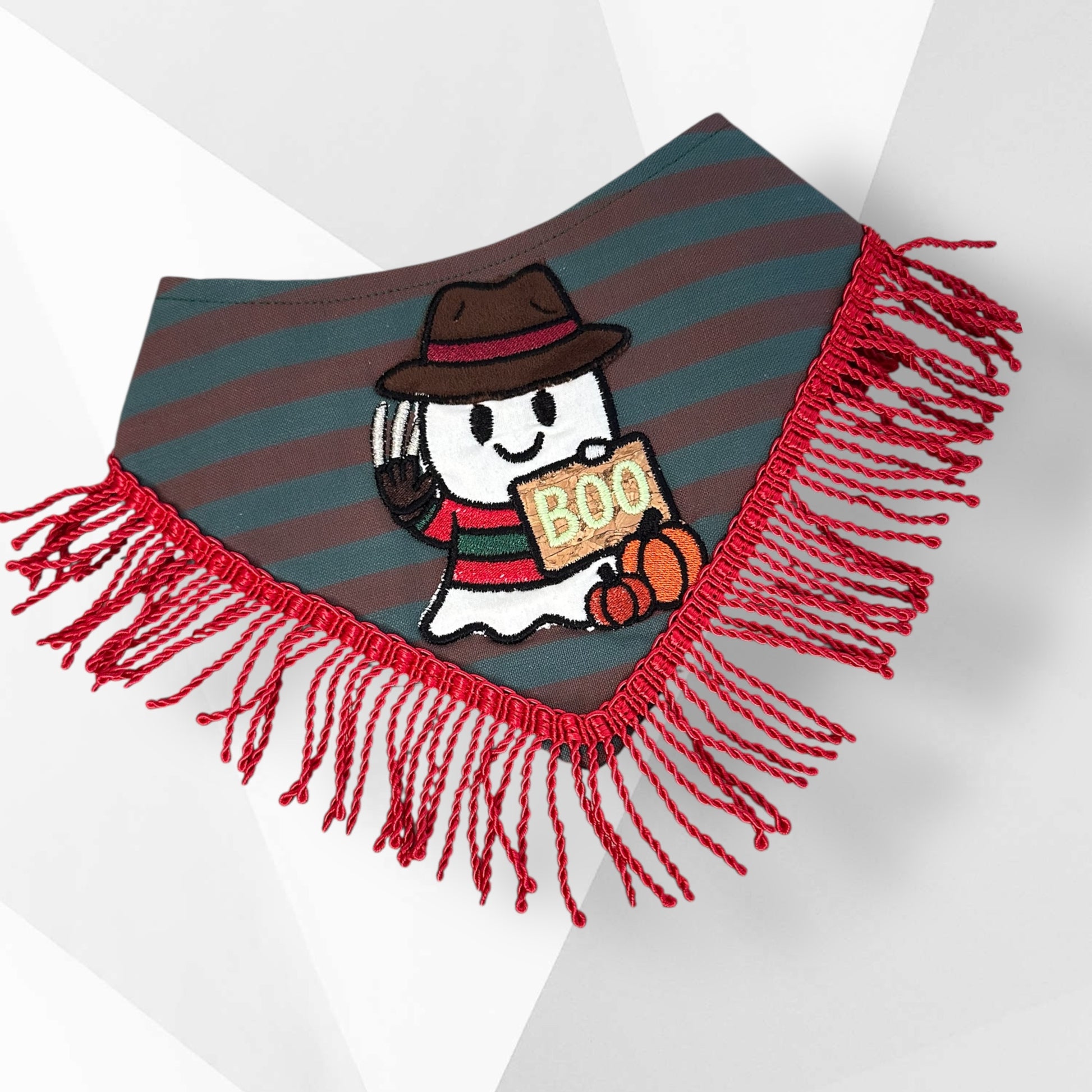 Add a playful scare to spooky season with this luxury handmade appliqué dog bandana from the Haunting Couture 2025 Collection. Featuring a ghost in a Freddy-inspired outfit holding a glowing “BOO” sign, both the ghost and the word BOO glow in the dark for an extra magical effect. Finished with bold red fringe trim, this couture piece is the perfect mix of spooky and cute for Halloween.