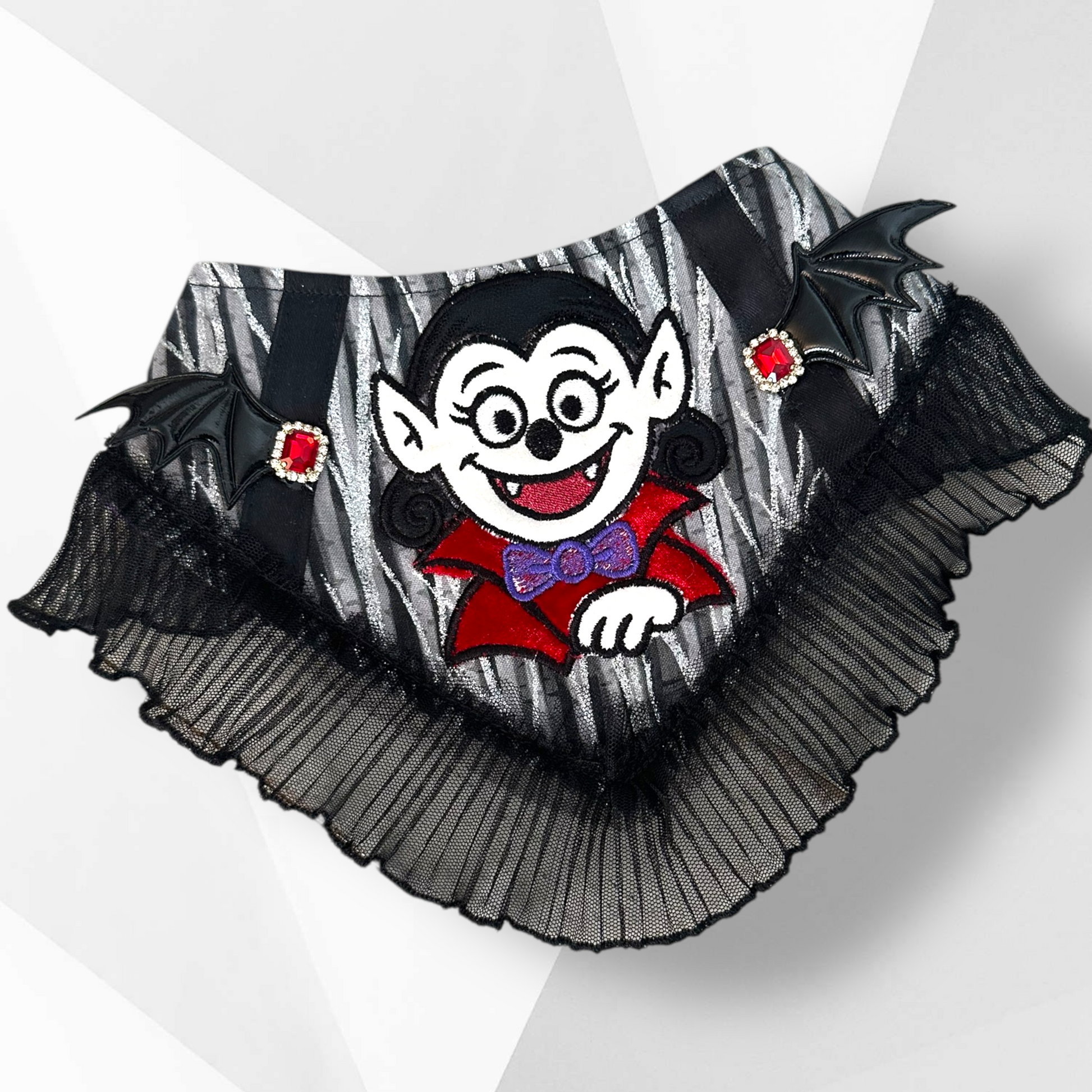 Bring gothic glamour to spooky season with the luxury handmade appliqué Vampire dog bandana from the Haunting Couture Halloween 2025 Collection. Set against a bold black-and-silver background, this design features a playful vampire appliqué framed by dramatic bat wing accents and sparkling red jewel details that resemble suspenders. Finished with a delicate ruffle trim, this couture piece adds a touch of elegance to Halloween celebrations while keeping its spooky charm.