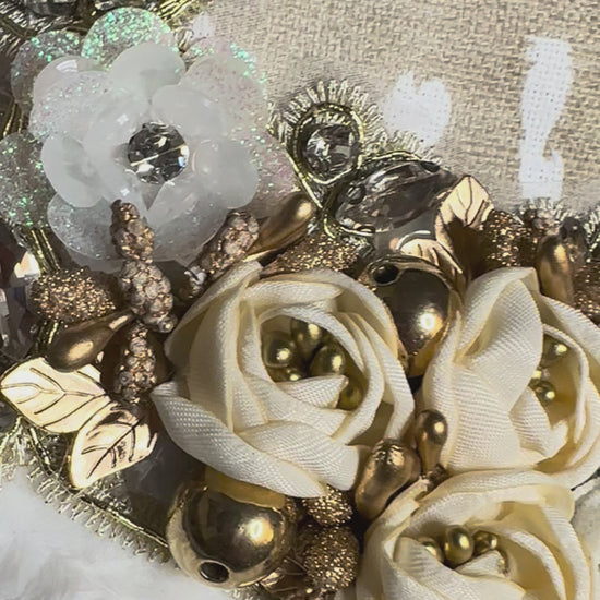 This couture bandanna is designed to shine for the holidays. Crafted on an elegant ivory-and-taupe winter print, it features a stunning arrangement of jewel flowers, pearl accents, and embroidered gold details. Each embellishment is creating a dimensional, luxurious look that photographs beautifully.