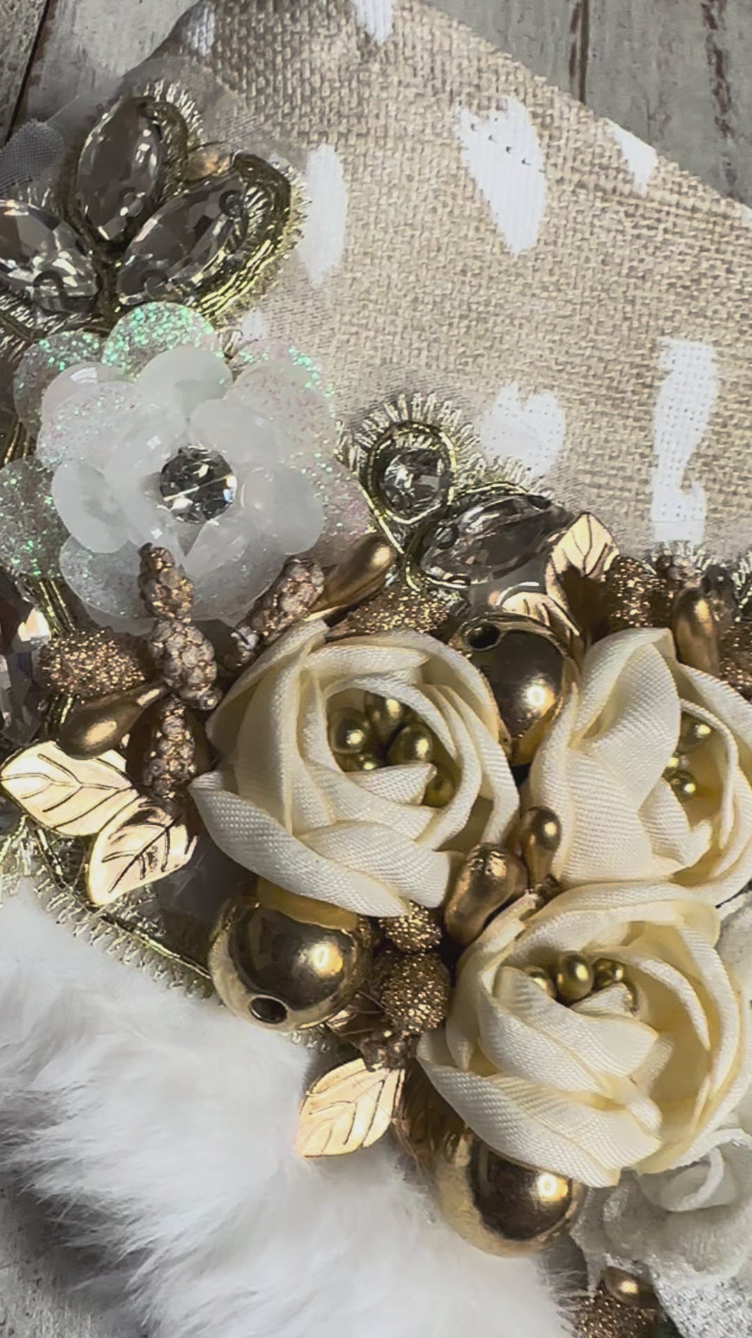 Luxury Winter Floral Jewel Dog Bandanna – Ivory & Gold Couture with Faux Fur Trim (Holiday Limited Edition)