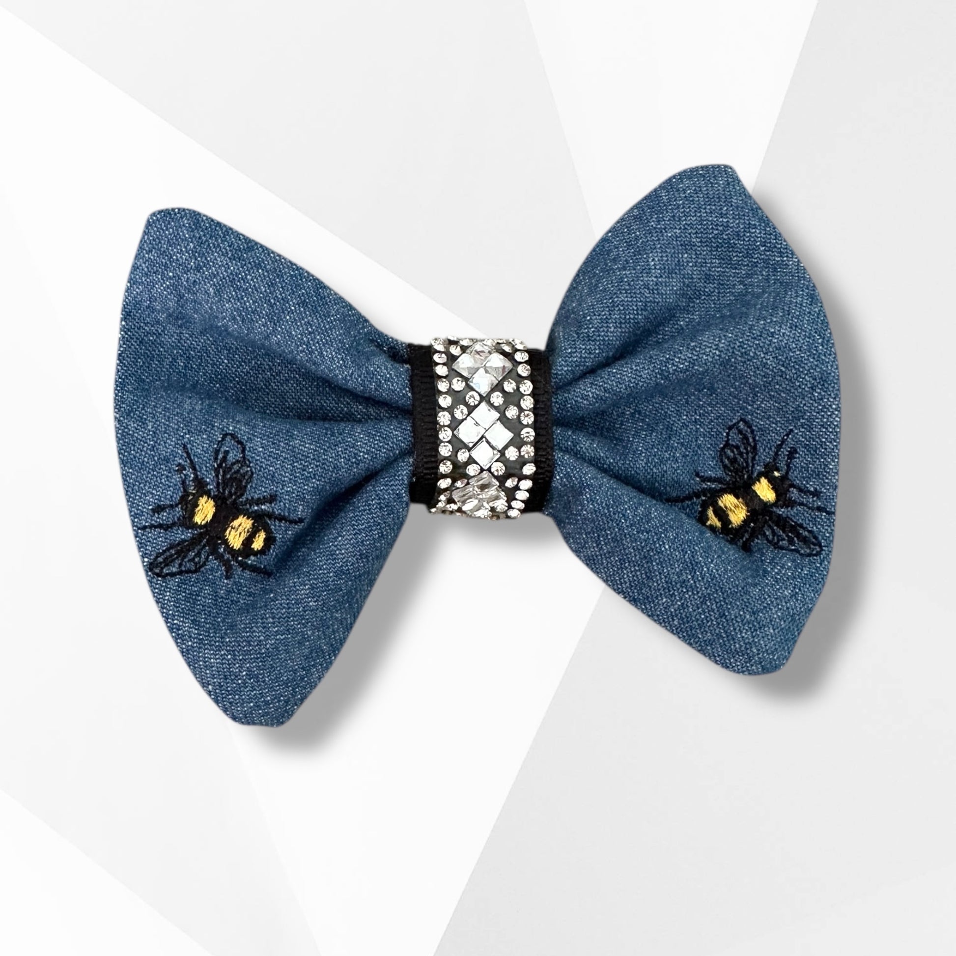 Embroidered Denim Bee Dog Hair Bow with Crystal Accent β Matches Luxury Bee Bandanna
